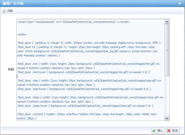 支持引入外部包含html,css,js的广告效果代码,系统会自动转换为CMS可管理广告代码。