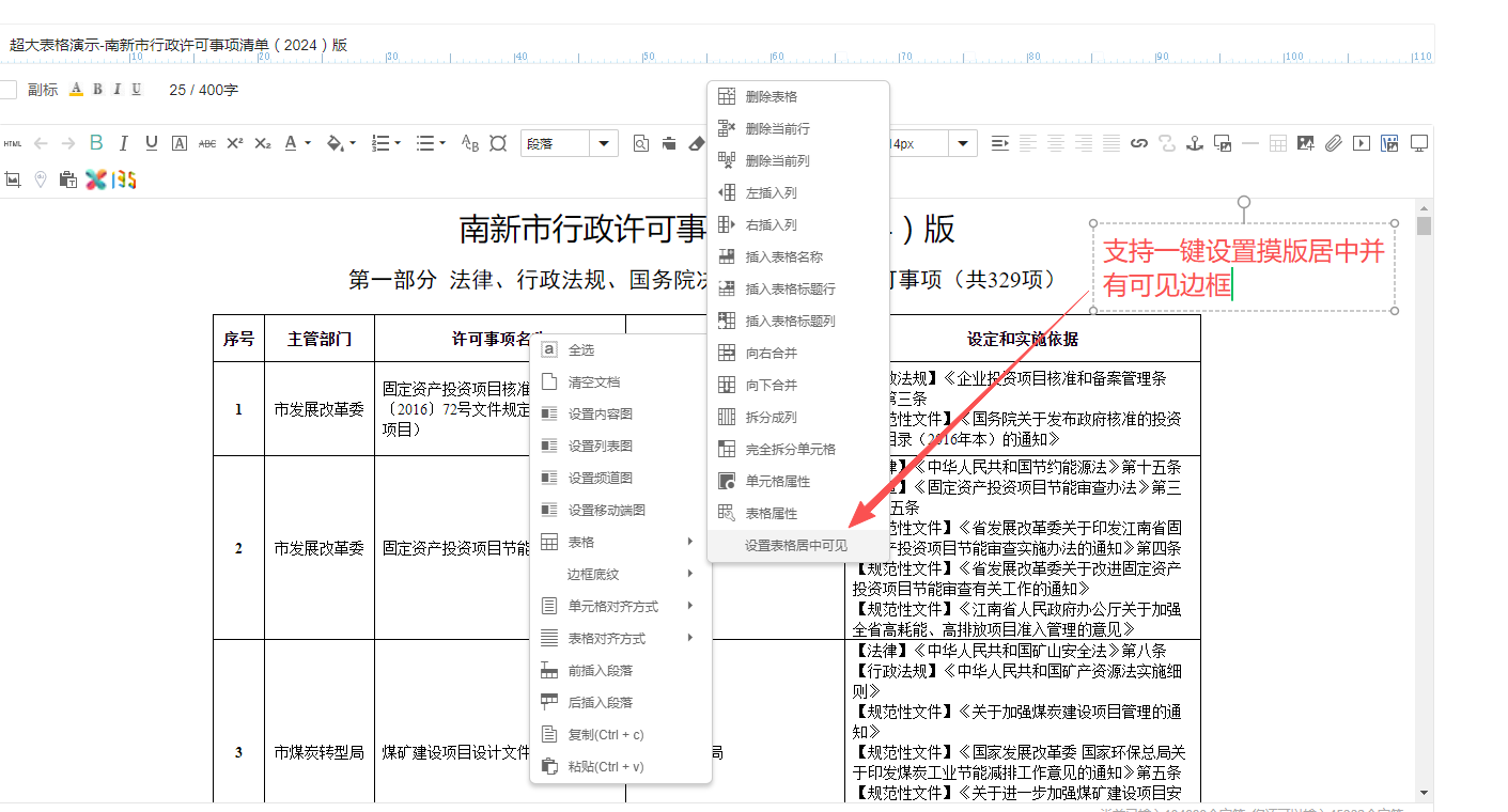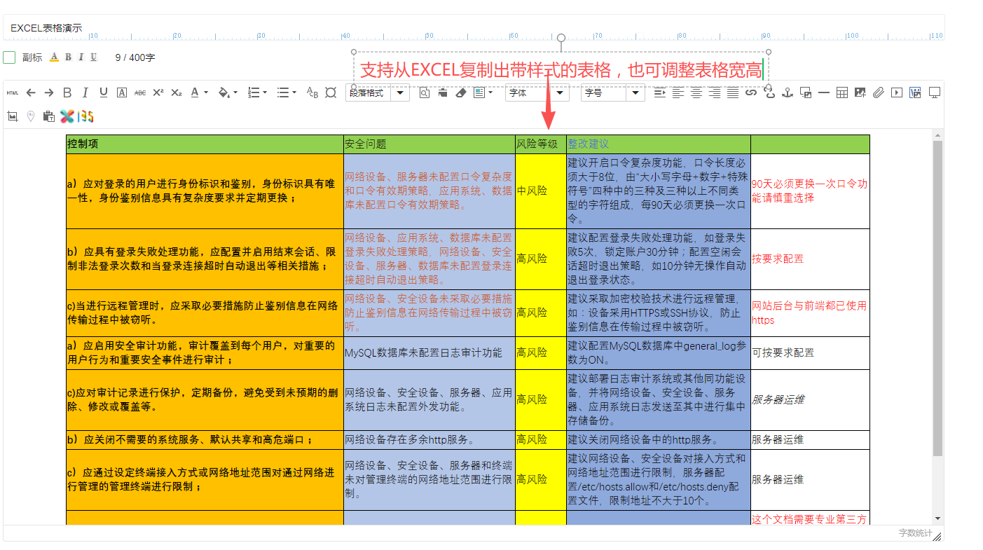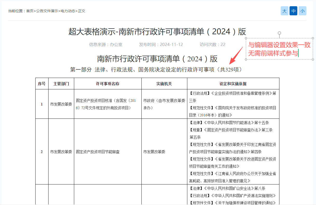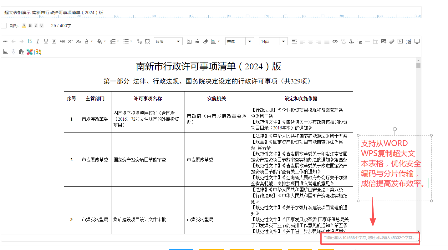 介绍 : CMS内容发布优化,支持从WORD WPS EXCEL复制超大文本表格内容,优化超大文本安全编码效率与分片提交,发布大文本性能成倍提升。并优化富文本编辑器表格功能,支持一键表格居中与前端边框可见,支持从EXCEL复制的表格保留样式,可拖动行列宽高。